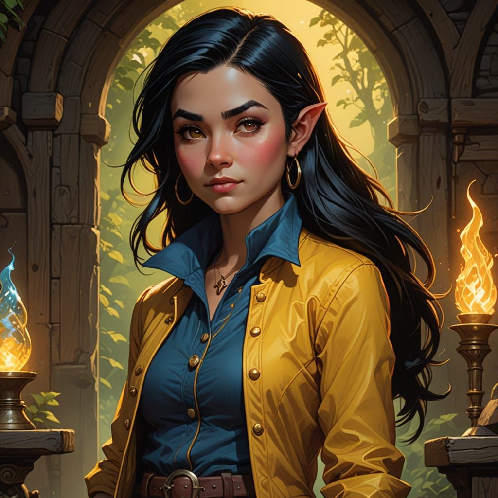 This image shows a female gnome sorcerer in vibrant comic book style. The close-up shot highlights her attire and smooth features, enhanced by perfect lighting and vivid colors.