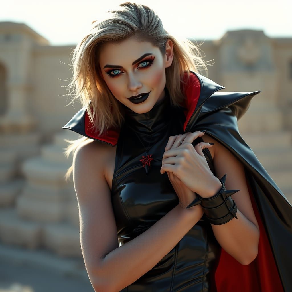 This striking image features a vampiress with bold red eye shadow, black lips, and dark blonde hair, dressed in a black latex dress and cape, set against a bright sunny background with a warm glow.