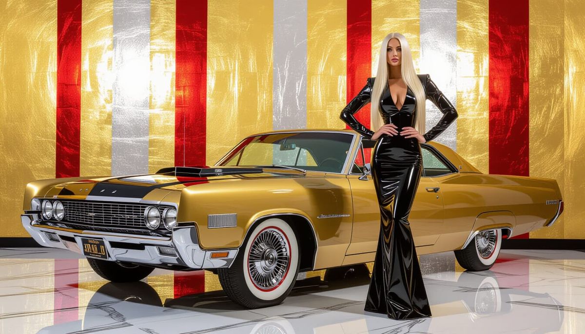 This image features an albino fashion model in a latex outfit beside a detailed retro muscle car. The artwork is an abstract acrylic painting with textured brush strokes in gold and beige tones.