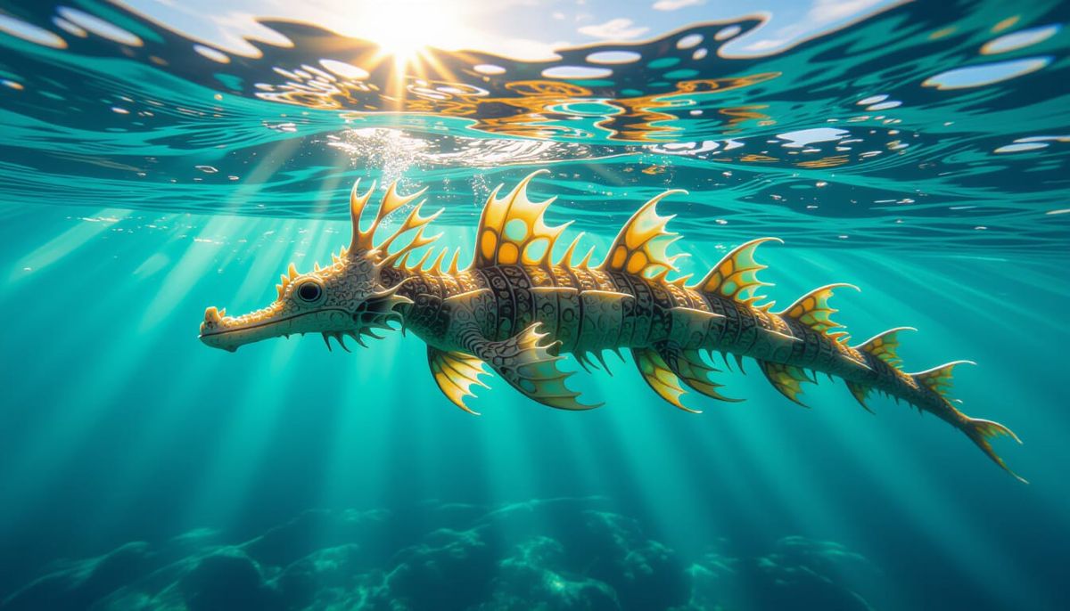 This image shows a sea dragon swimming in clear, turquoise water. Sunlight creates reflections on the gentle waves, captured with photorealistic detail and intricate textures.