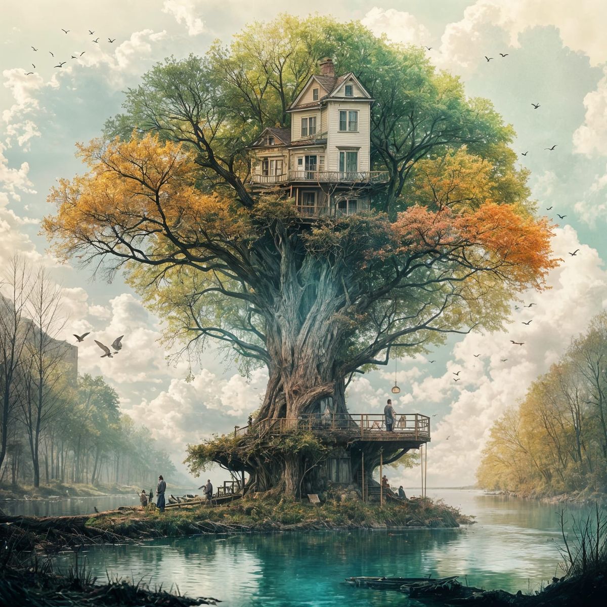 This image shows a fantastical scene within a broken porcelain cup, featuring a majestic oak tree with a house inside, surrounded by a serene lake and vibrant colors, bathed in soft, divine light.