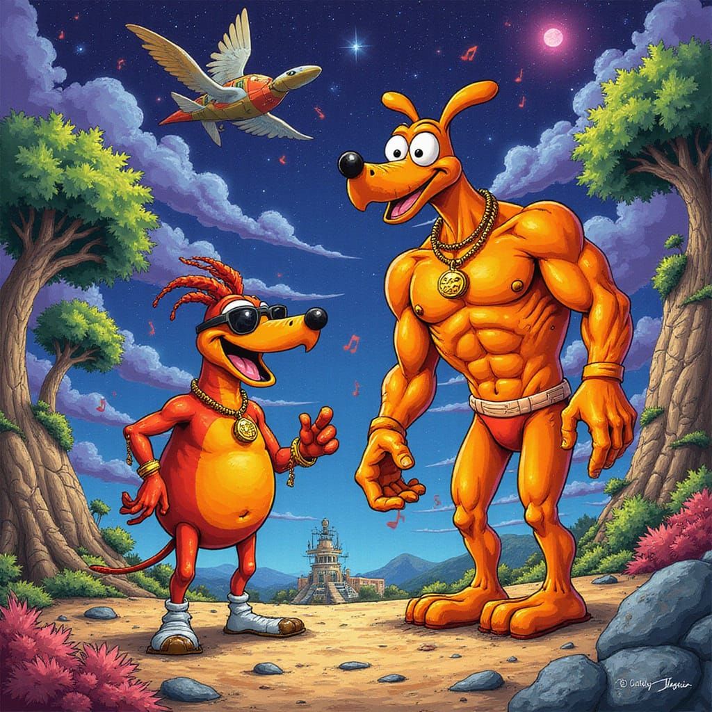A hyperrealistic comic book style image of ToeJam and Earl on Funkotron. The alien landscape pulses with vibrant colors, abstract trees, and funky architecture in a post-impressionist style.