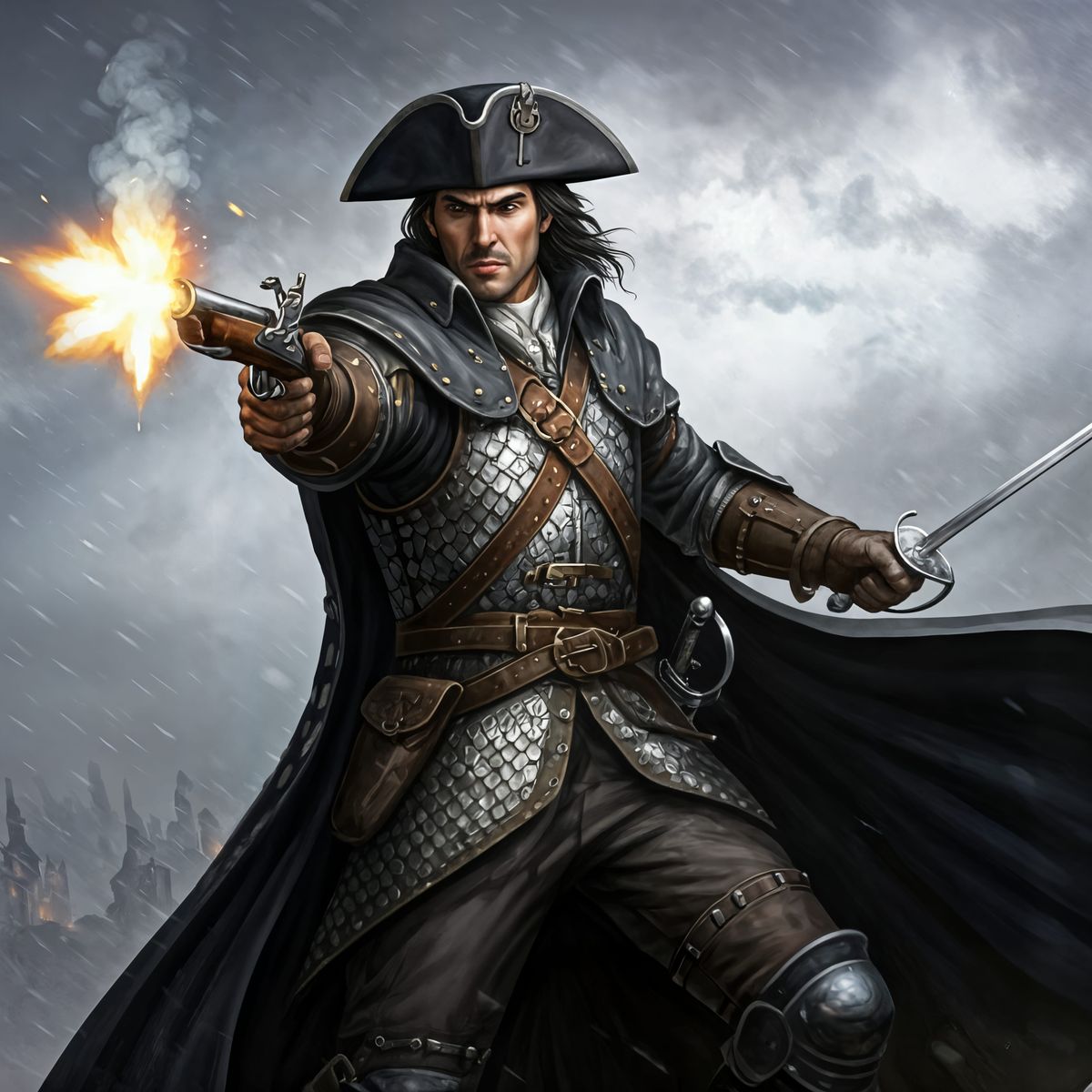 This image depicts a male D&D fighter in dynamic action, firing a flintlock pistol. He's equipped with layered armor and a dramatic 16th-century greatcoat, set in a tense battle scene.