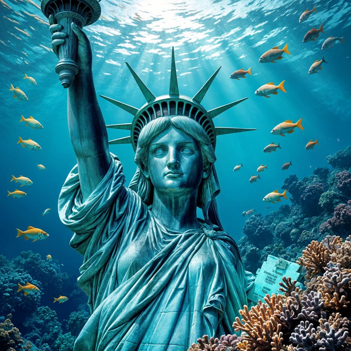 A hyperrealistic, highly detailed close-up of the Statue of Liberty submerged below sea level, featuring an intricate and colorful coral reef teeming with fish.