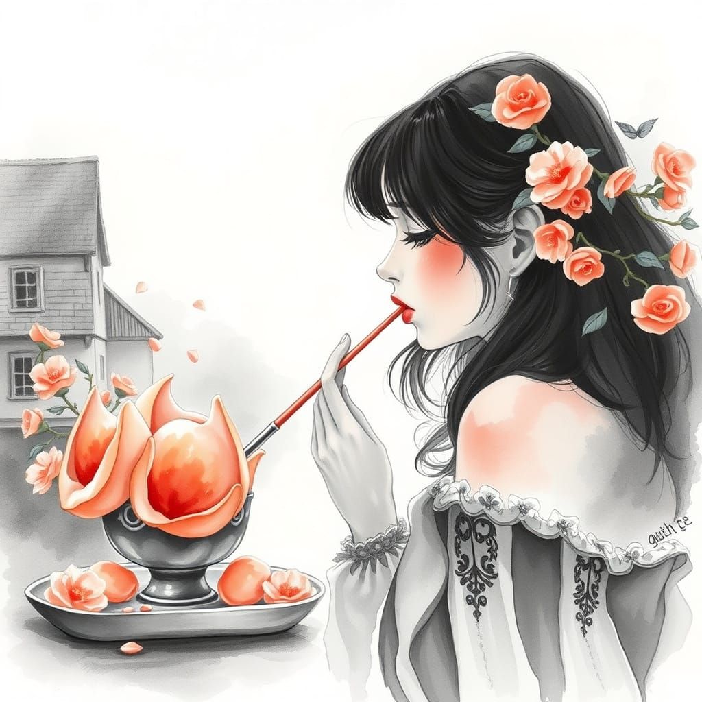 This image shows Sophie Marceau eating a peach in a misty, ethereal fantasy scene. The artwork is rendered in monochrome watercolors with hyperdetailed features.