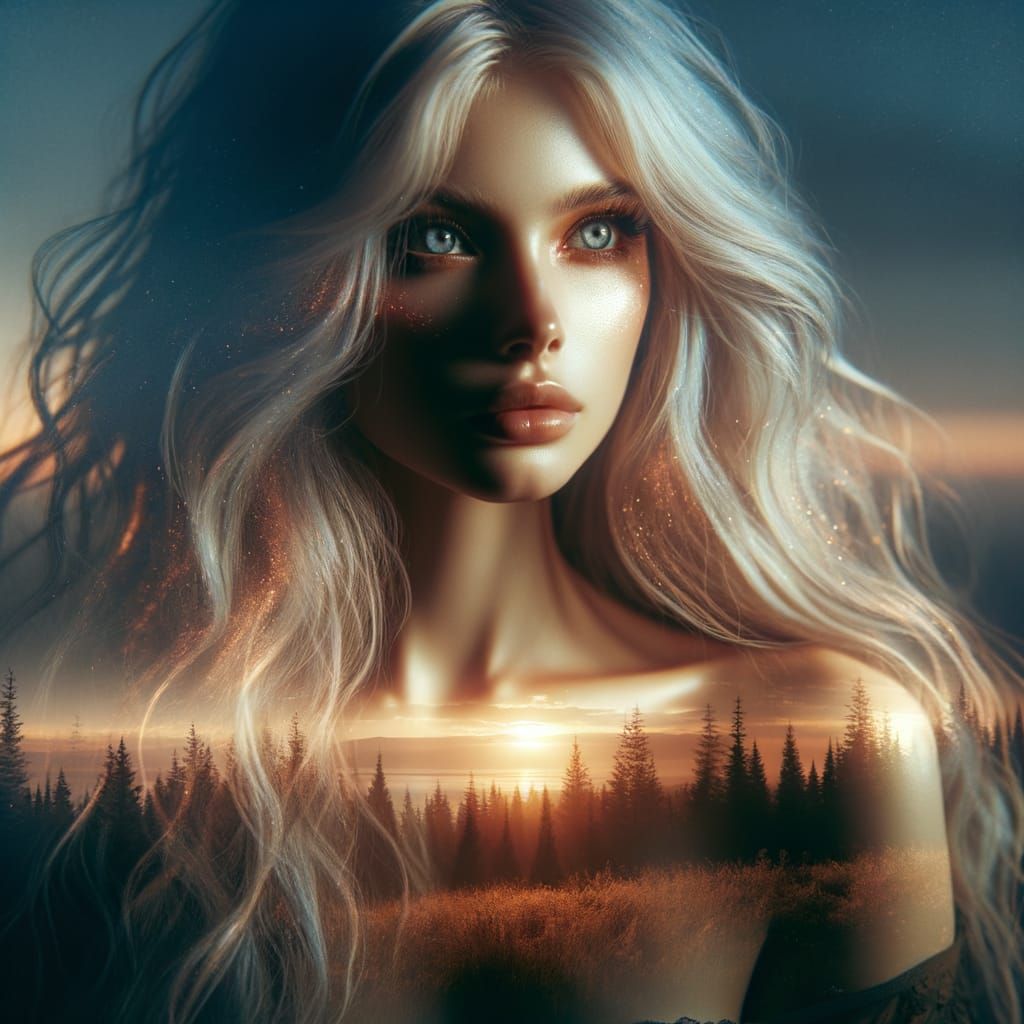 This image combines a serene forest at dusk with an ethereal fantasy portrait, blending warm twilight hues with shimmering light hair and glowing eyes in a minimalist double exposure.