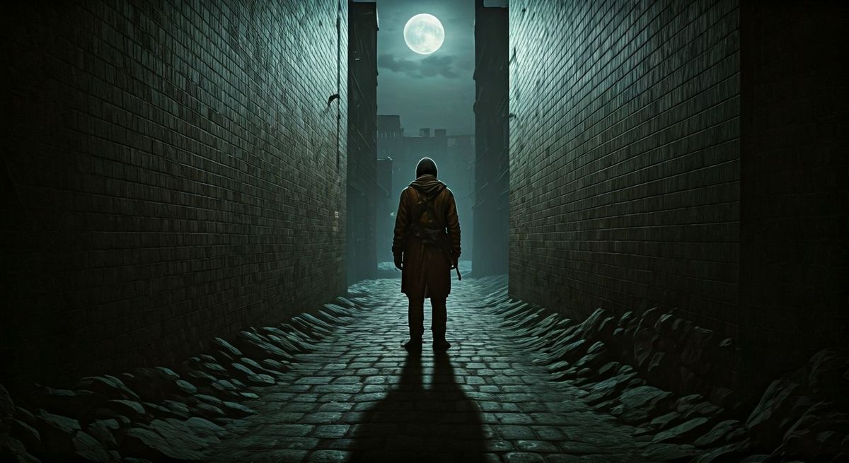 This image shows a solitary figure in muted, cinematic colors standing in a deserted alley. The artwork features high contrast shading in a dystopian, atmospheric style.