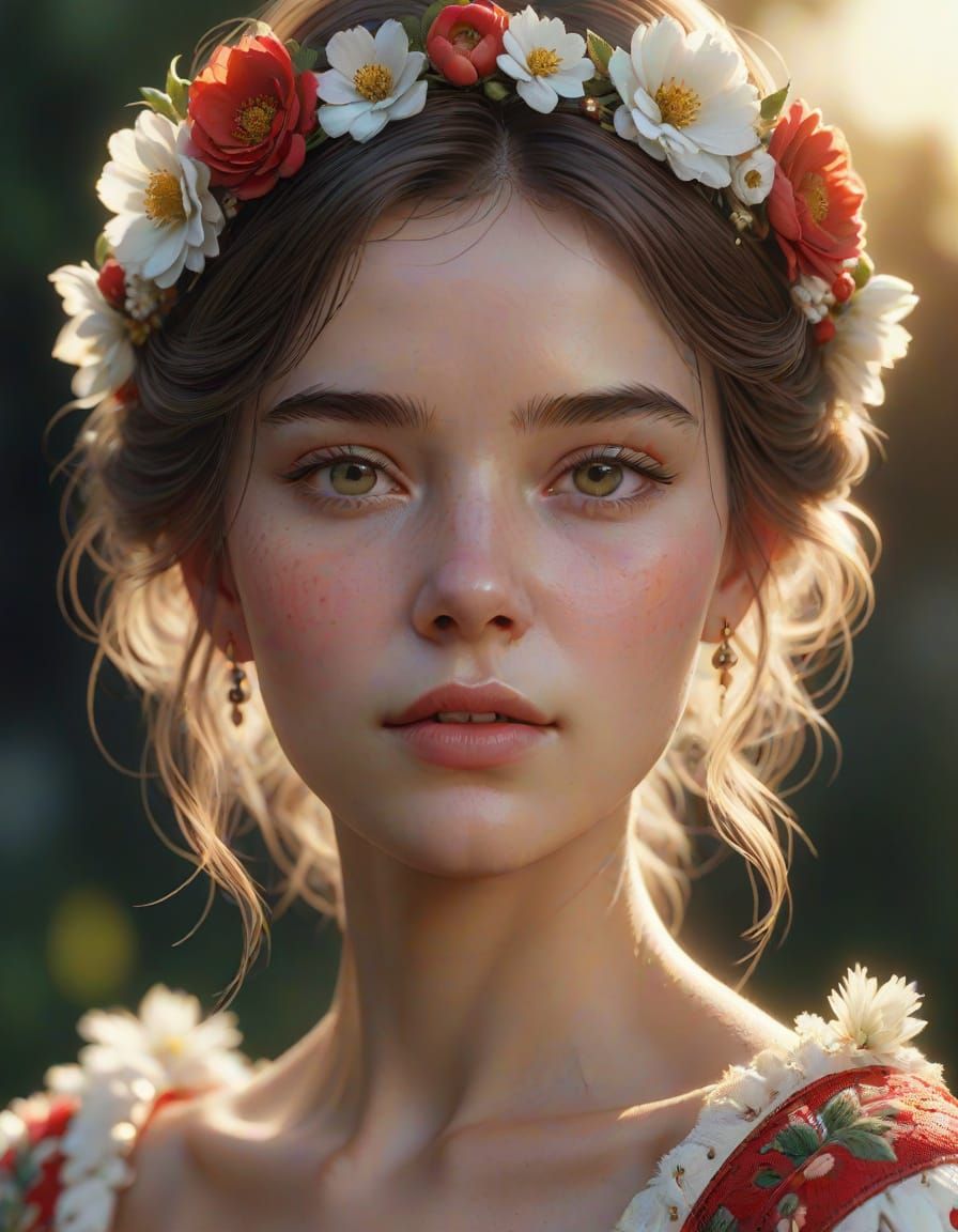 This hyperrealistic image showcases a beautiful woman with fair skin and dark eyes, adorned with a lush floral crown and an intricately embroidered dress. Captured in soft, golden hour light, the fine details of her makeup and skin are vividly rendered.