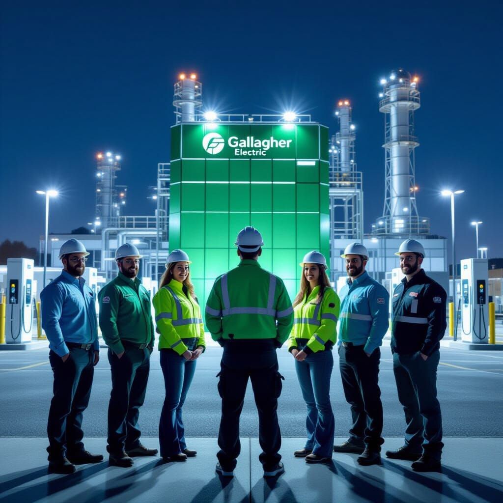 This image showcases a diverse team in front of a mega battery storage plant. The facility, rendered in a futuristic style, features green and gold accents, efficient LED lighting, and integrated EV charging stations.
