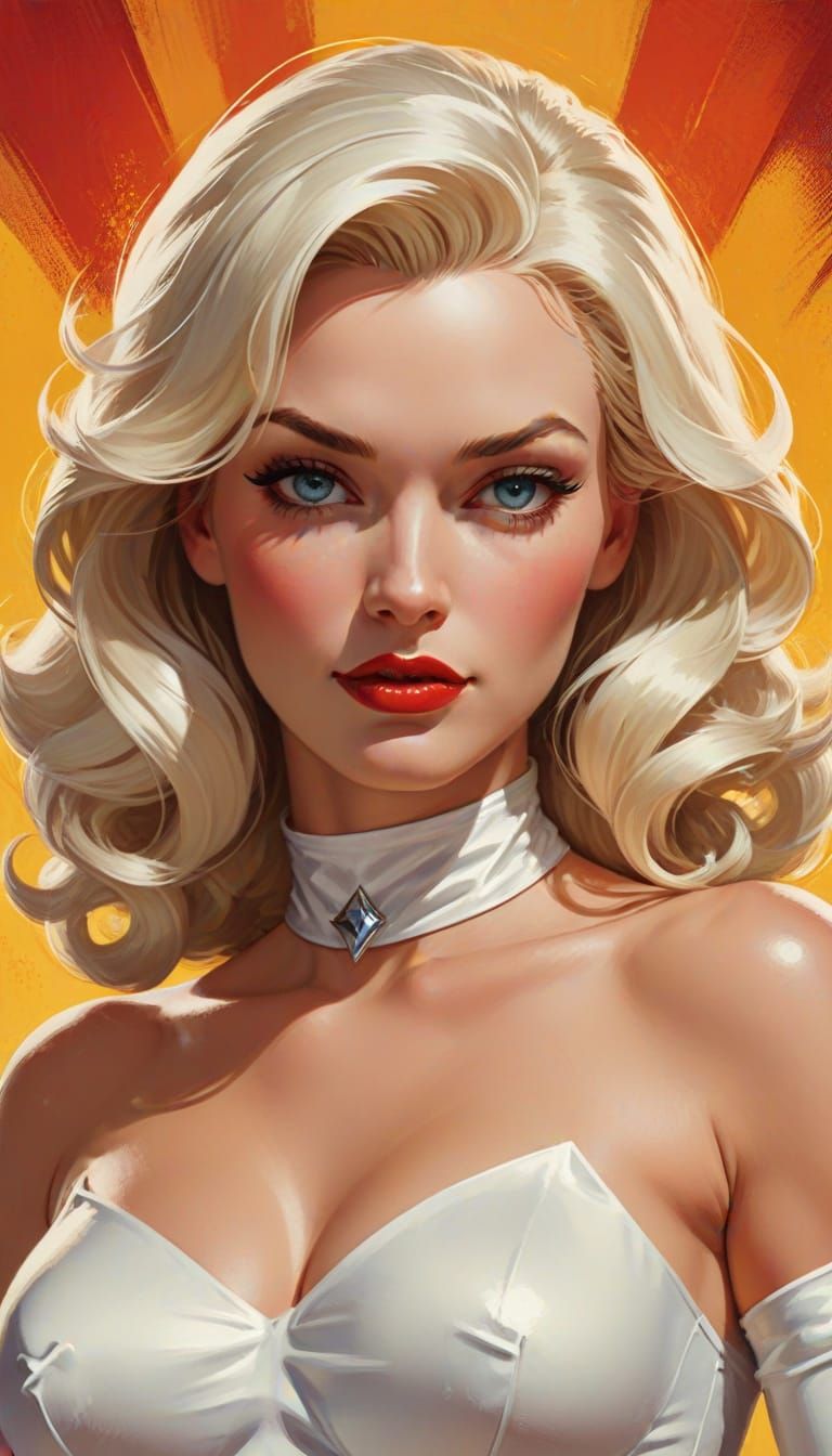 A vibrant, close-up portrait of a superheroine in a white costume. The artwork showcases a retro, 1950s-inspired pinup style with an oily painting aesthetic and soft brushstrokes.