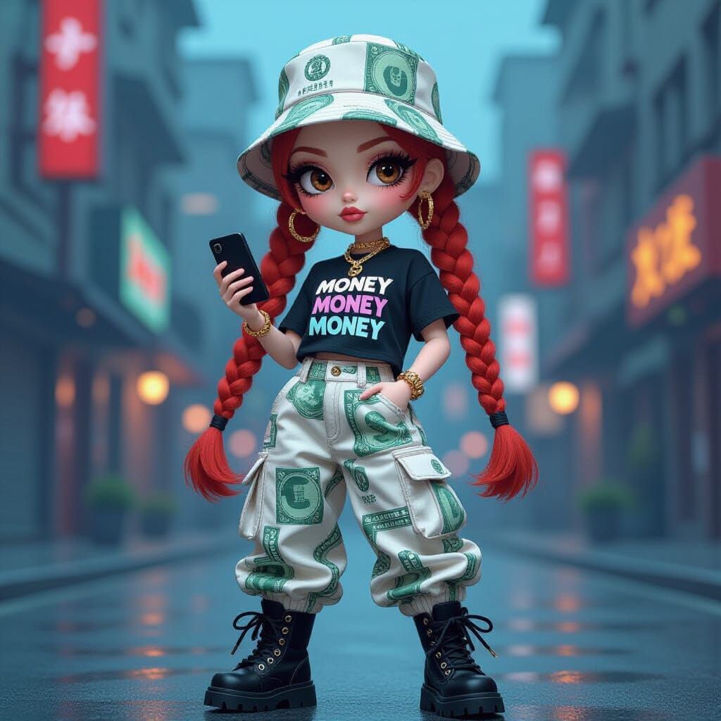 This image shows a fashionable doll-like character with auburn braids in a playful pop art style. The figure wears patterned cargo pants, a slogan t-shirt, combat boots and holds a smartphone, in a vibrant digital portrait.