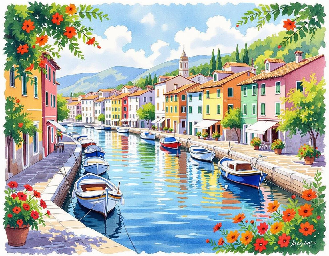 This image shows a vibrant watercolor harbor scene. Colorful buildings line the waterway, with boats moored in the calm water. Bright orange flowers cascade down the shore, creating depth and serenity.