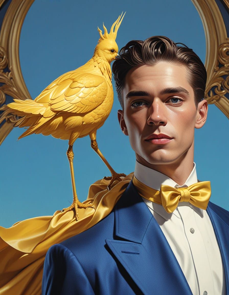 A striking medium shot of a standing figure rendered in a retro acrylic style. The image features soft pastel colors with eldritch yellow and blue hues, bathed in warm golden lighting. The art blends realism and stylization.