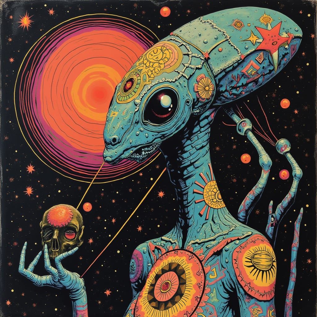 This image features a futuristic, hybrid creature with an intricate, cubist tattoo, set against a psychedelic, swirly background that blends organic and geometric shapes, with bold, black lines and vibrant, neon colors, in the style of op-art and biomechanics art