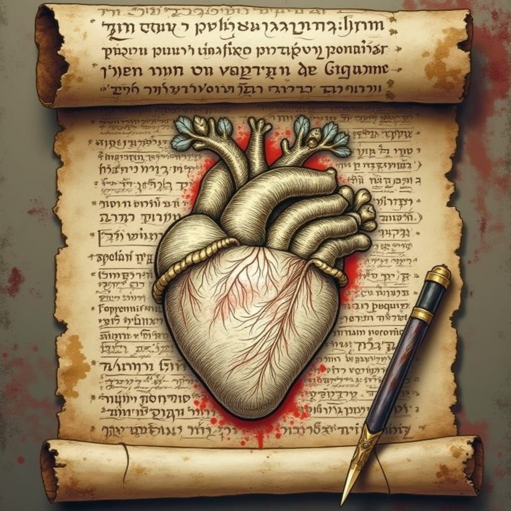 This image depicts an old parchment scroll, unrolled and open, adorned with intricate Hebrew letters written in sepia ink, resting on a vibrant red heart symbolizing love and passion. A goose quill pen lies on the parchment, ready to write stories and secrets, set against a warm background of wood and le...