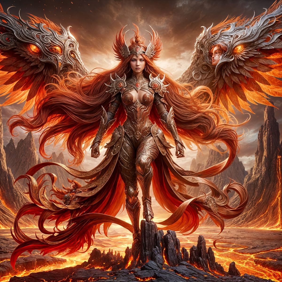 A striking picture of a South Asian female warrior with flowing red hair, in crimson armor, standing on an armored phoenix. The scene is set in a volcanic landscape with dramatic lighting, rendered as highly detailed concept art.