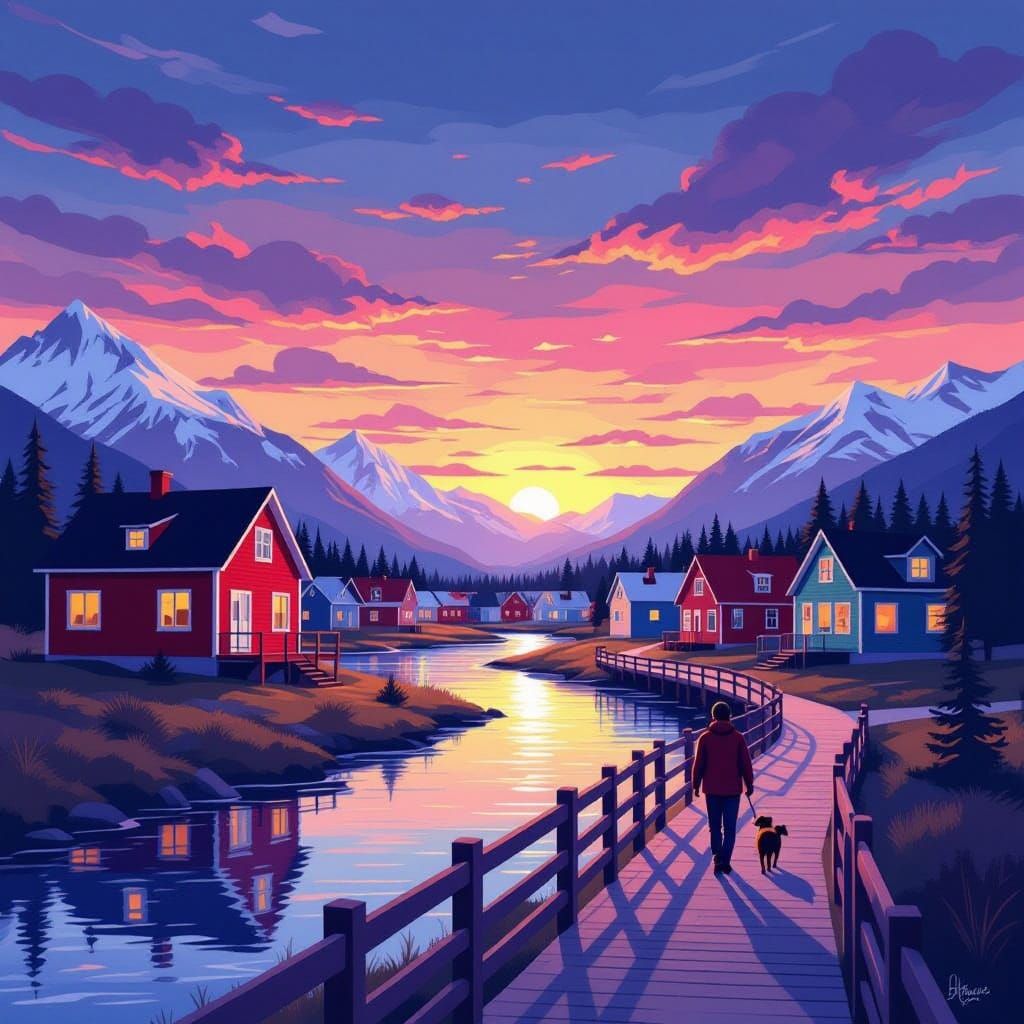 This serene image depicts a small Alaskan village with modern houses in bright primary colours, set against a backdrop of snow-capped mountains and a peaceful evening sky with clouds, as the warm glow of sunset casts a golden light on the scene, blending bold geometric forms with delicate realism.