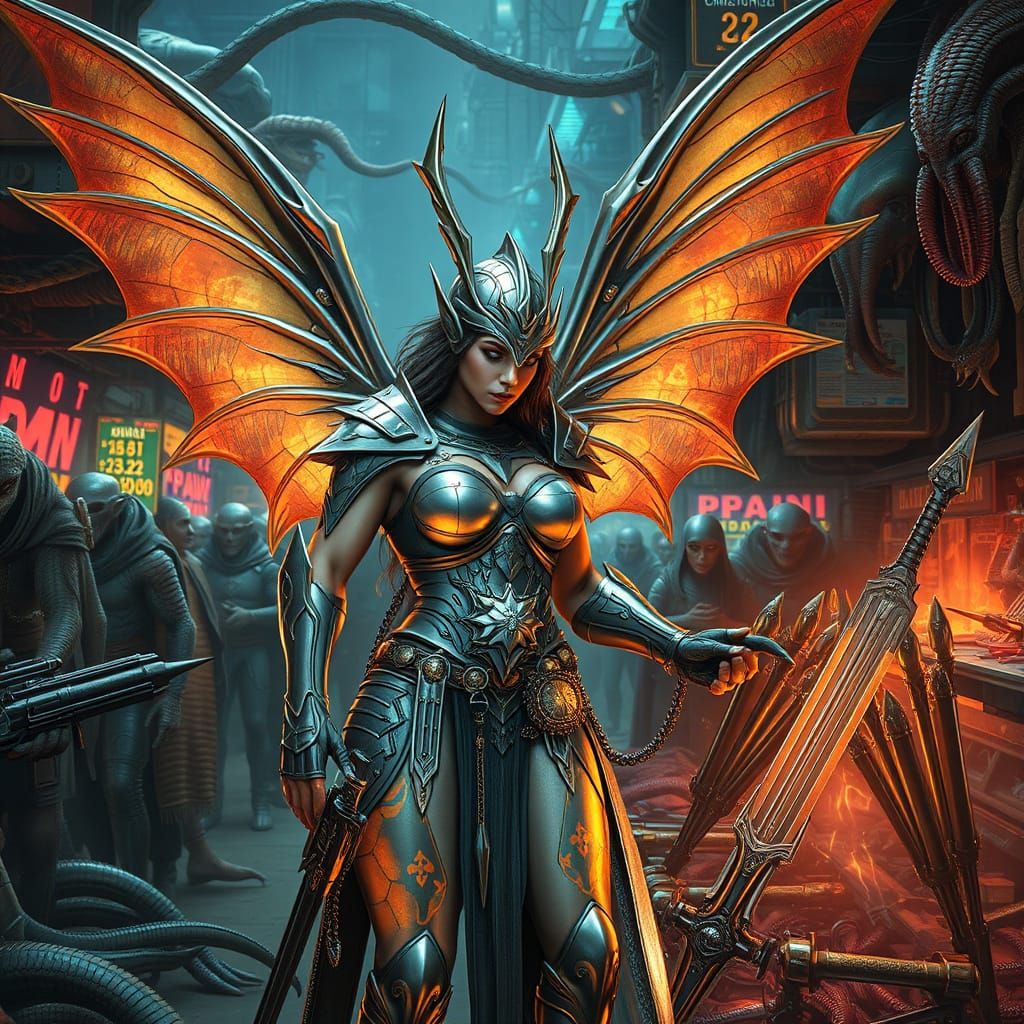 This image shows a muscular fairy warrior with dragonfly wings examining advanced weaponry at an alien market. The scene is rendered with photorealistic detail and dark fantasy elements.