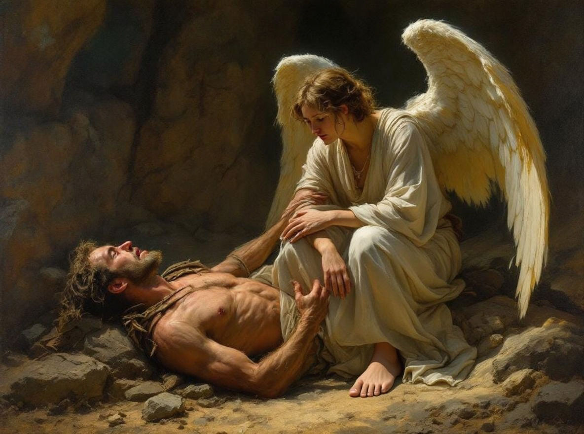 This image shows a tender embrace between an angel and a weary man, set against a backdrop of rocks and earth. The artwork evokes the style of baroque masters.
