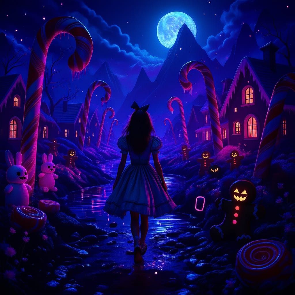 This image depicts a surreal, dark fantasy candy landscape inspired by Alice in Wonderland. Eerie candy formations and twisted creatures surround a mysterious girl with a glowing lantern. The scene is highly detailed with gothic and whimsical elements.