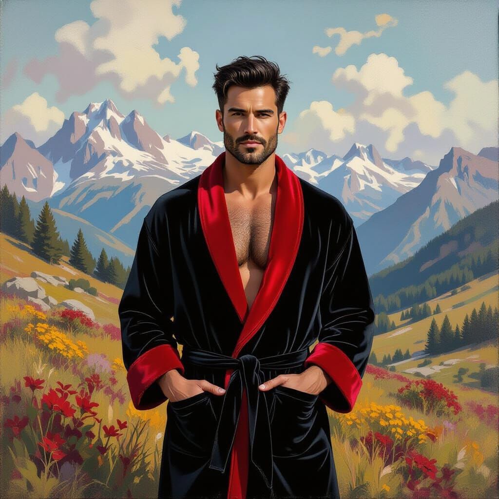 This image shows a handsome, stubbled man in a velvet robe, set against a mountain backdrop. The portrait is rendered in an impressionistic style, with vibrant colors and dynamic lighting. The aesthetic blends realism with expressive brushstrokes.