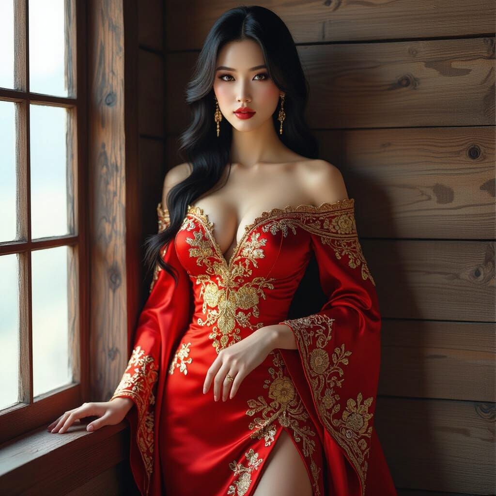 A striking picture of a beautiful Chinese woman in a red silk gown posing against a wooden wall. This glamorous 3D digital art features vibrant colors, intricate details, and hyperrealistic textures.