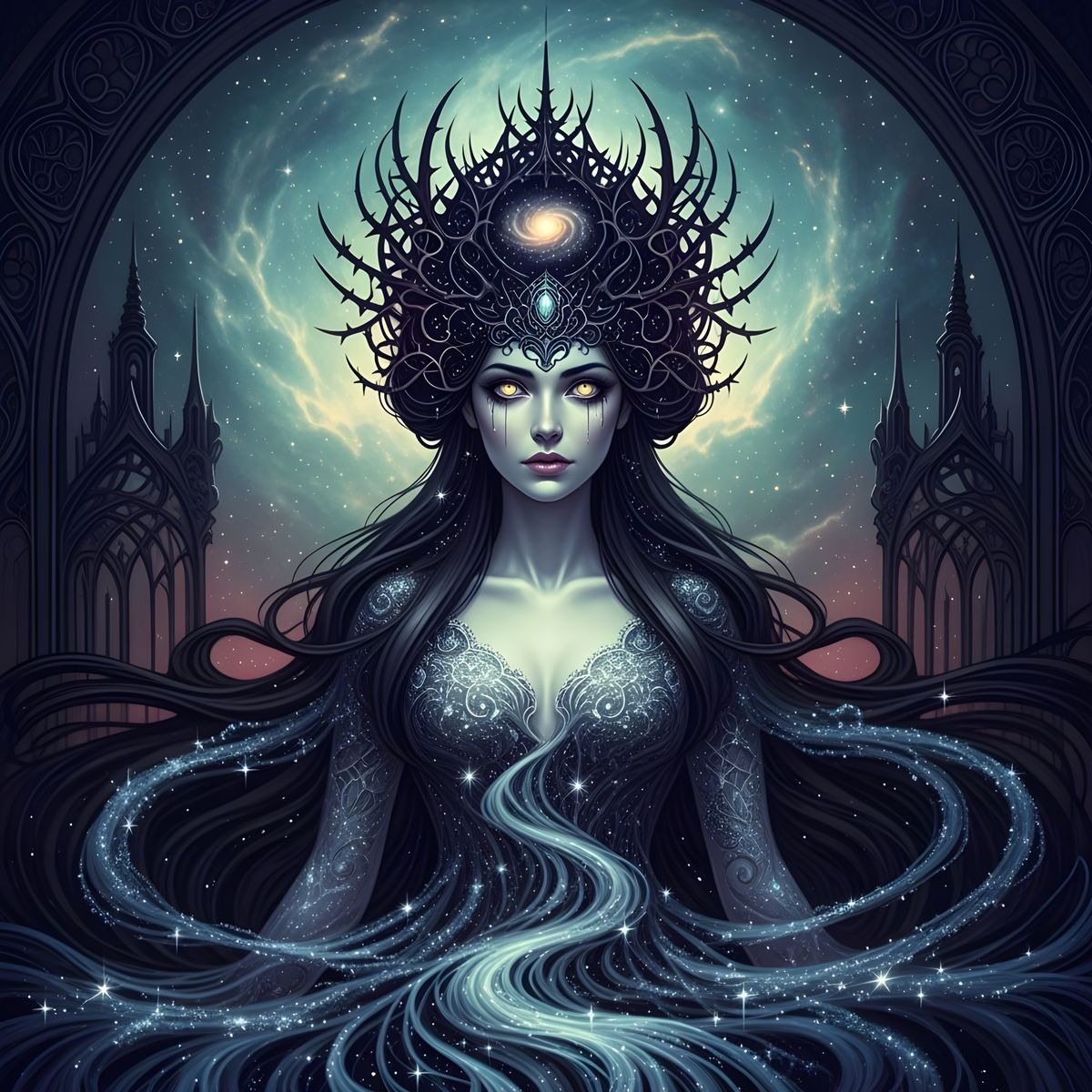 A striking picture of a nebula goddess with stardust hair and cosmic eyes. She wears a gown of starlight, blending with the swirling cosmos in a gothic art style.