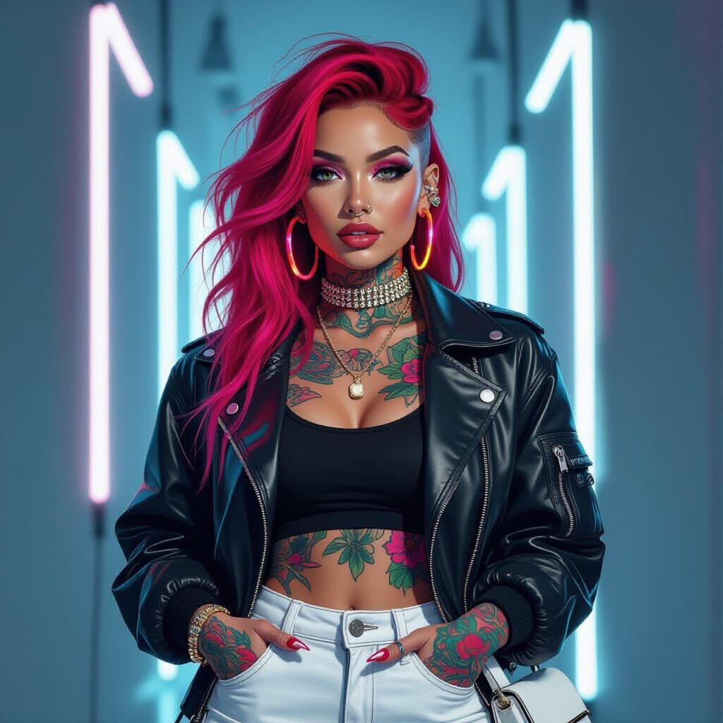 A vibrant digital oil painting of a sassy woman with neon red hair and tattoos. She sports a black jacket and ripped jeans against a backdrop of dynamic neon lights in a futuristic aesthetic.