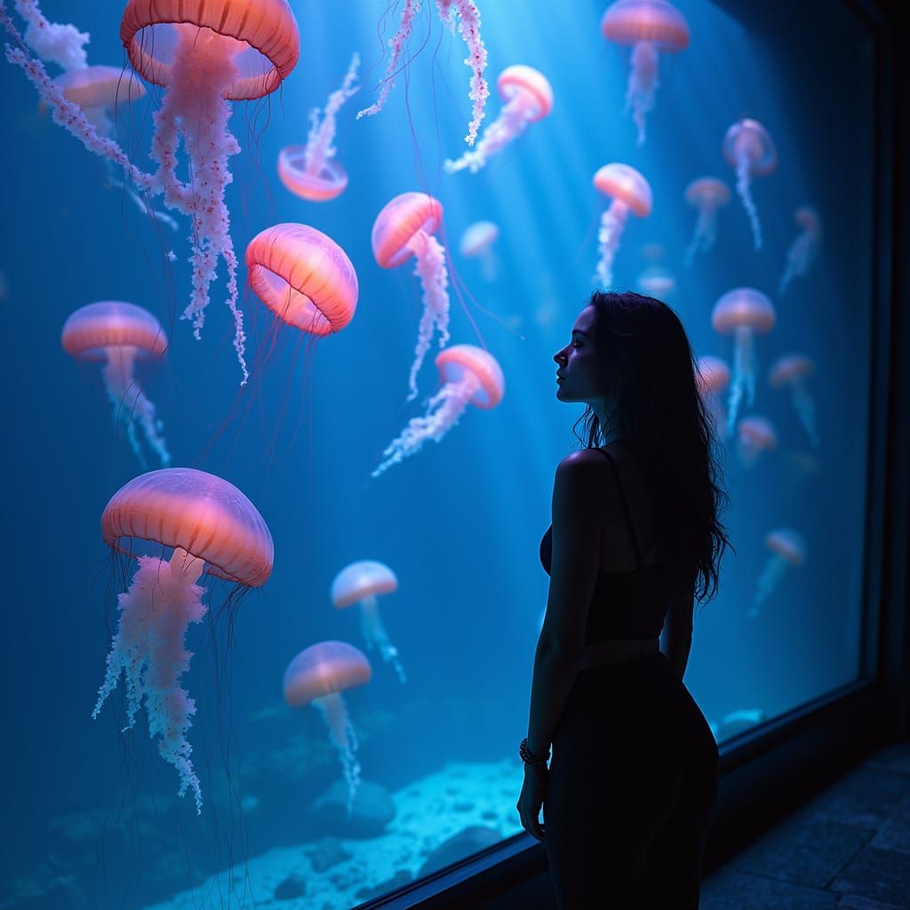 A captivating image of a woman observing a large jellyfish aquarium. The scene is illuminated with fluorescent lights at night, creating a cinematic and hyperrealistic atmosphere in a digital art style.