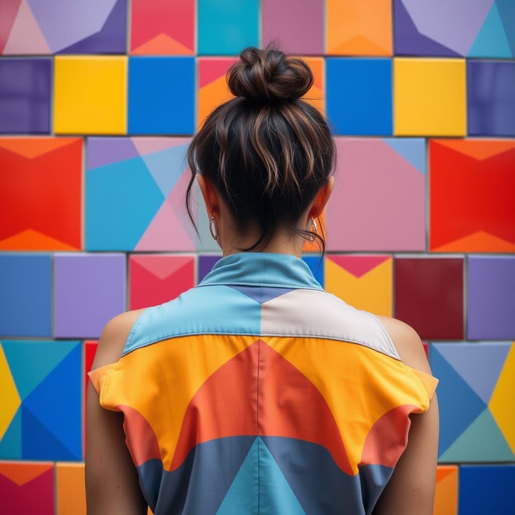 This image shows a woman posing before a colorful geometric tiled wall. The vibrant art is rendered in a bold, clashing color palette and a surrealist aesthetic.