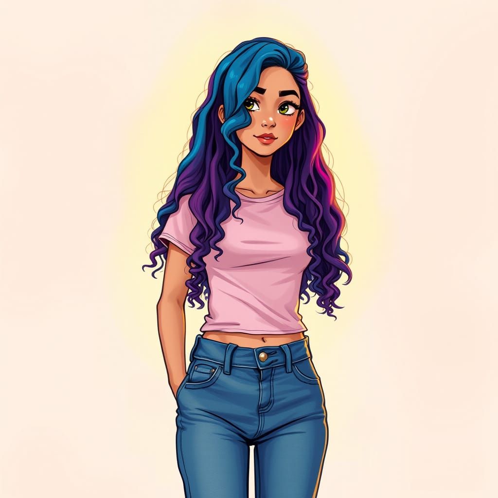 This image captures a carefree teenage girl in a relaxed pose, adorned in high-waisted jeans and a pastel pink t-shirt, surrounded by a soft, warm light reminiscent of whimsical illustration styles.