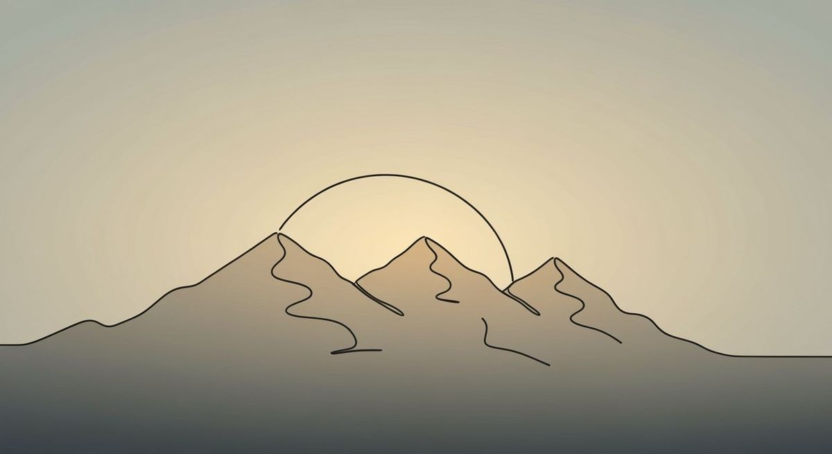 This image features a serene mountain range silhouette created with a single, unbroken line. It captures the quiet beauty of dawn with soft golden hour gradients and emphasis on negative space.