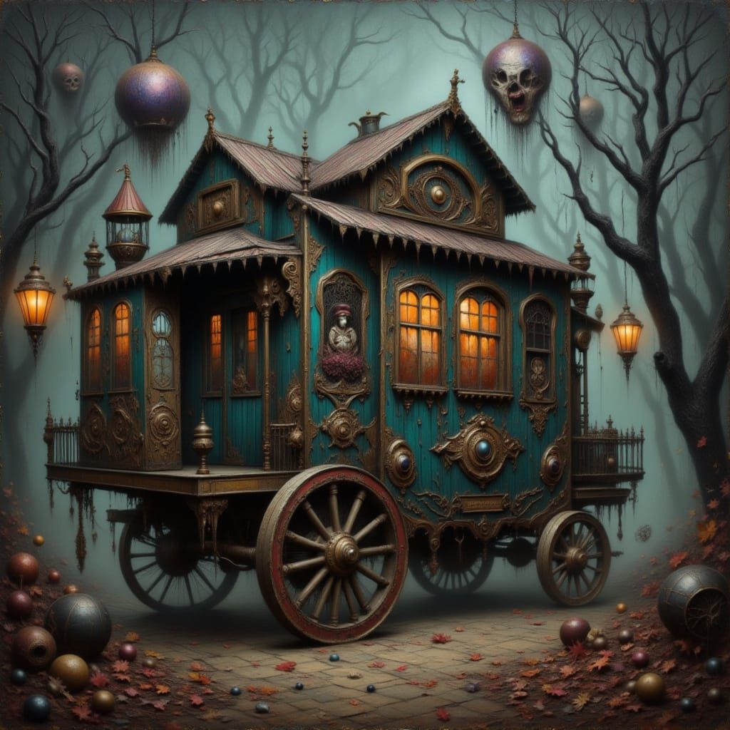 This image shows an abandoned steampunk carnival wagon with detailed carvings, tarnished brass, and peeling teal paint. Moody oil painting style with dramatic lighting creates a haunting, mysterious atmosphere.