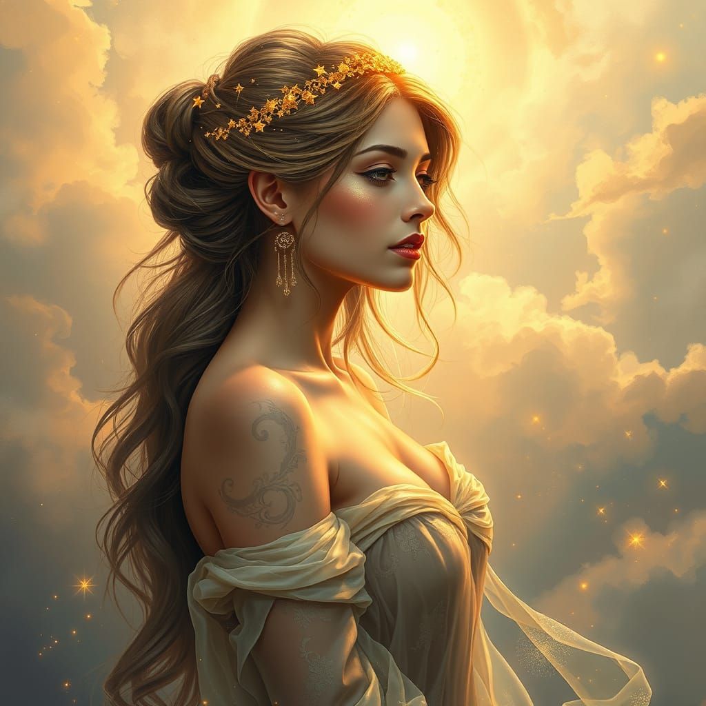 This image depicts a mystical, otherworldly goddess with delicate golden tattoos and a flowing, diaphanous gown, set against a dreamy, iridescent backdrop of swirling clouds and stardust, with a sense of enchanting magic and sensuality.