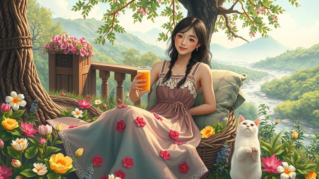 A serene image of a young Asian woman enjoying a peaceful moment in a vibrant garden. She is surrounded by nature and gentle features, with a playful cat nearby, in a whimsical anime art style.