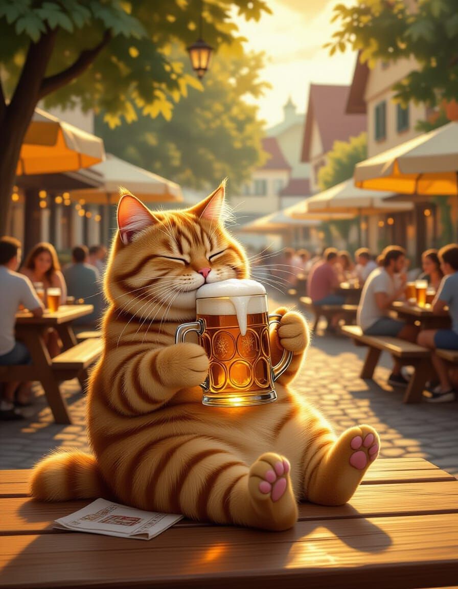 This image shows Garfield, the fat orange cat, relaxing in a Bavarian beer garden on a warm summer evening. Rendered in a vibrant, illustrative style with rich textures and warm colors.