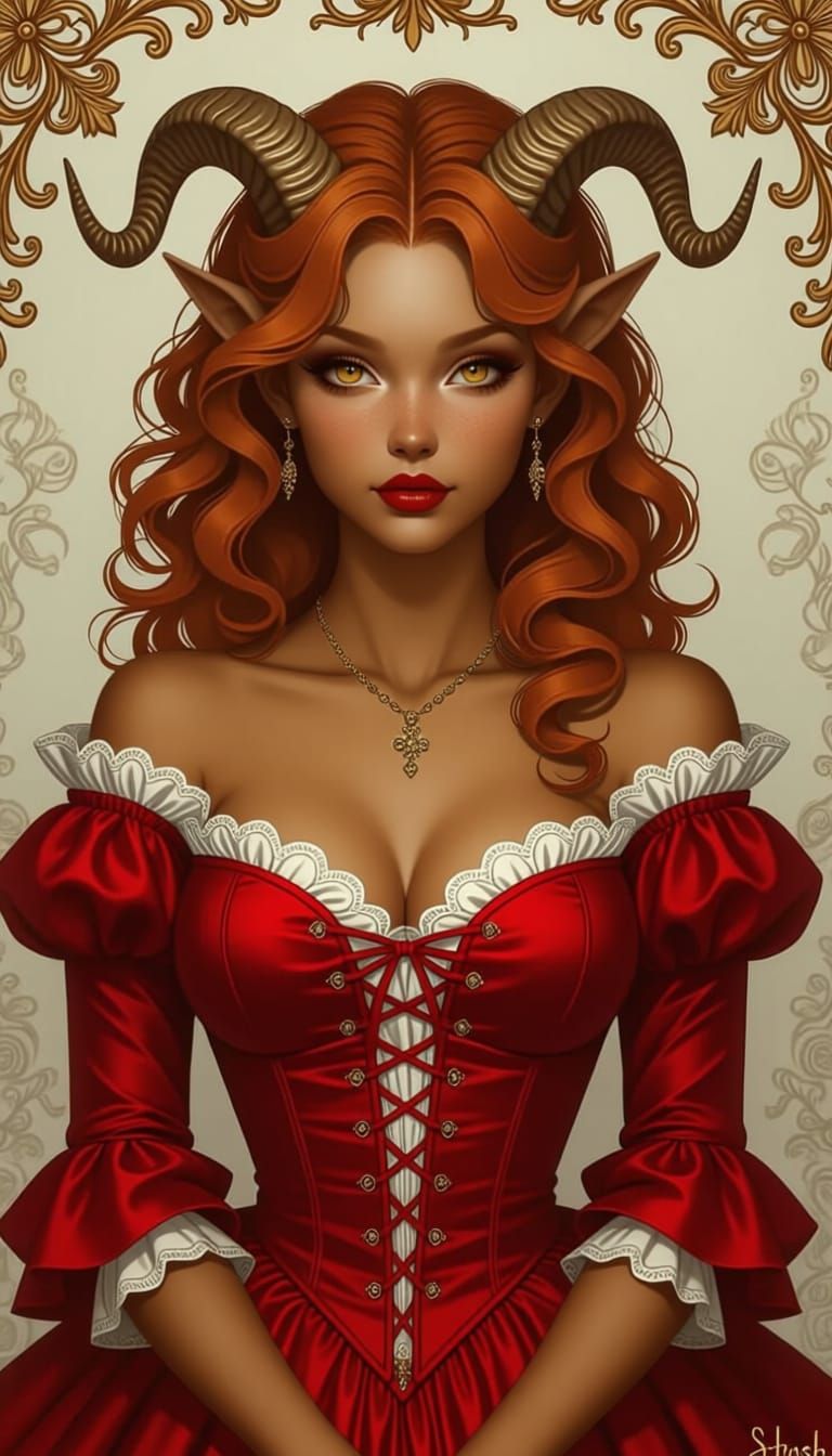 A striking picture of a beautiful demon with small goat horns and an innocent expression. She is depicted in a red baroque dress against a dramatic, softly illuminated backdrop in a dreamy digital realism style.