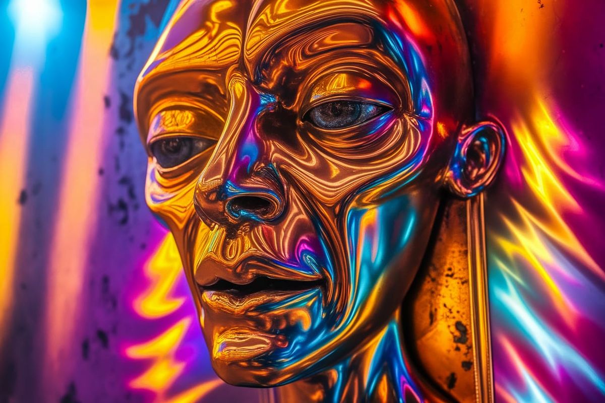 This striking image features a psychedelic caricature with distorted proportions, rendered in metallic chrome and mercury. Reflected colors and dramatic backlighting create an iridescent, shimmering effect against aged concrete walls.
