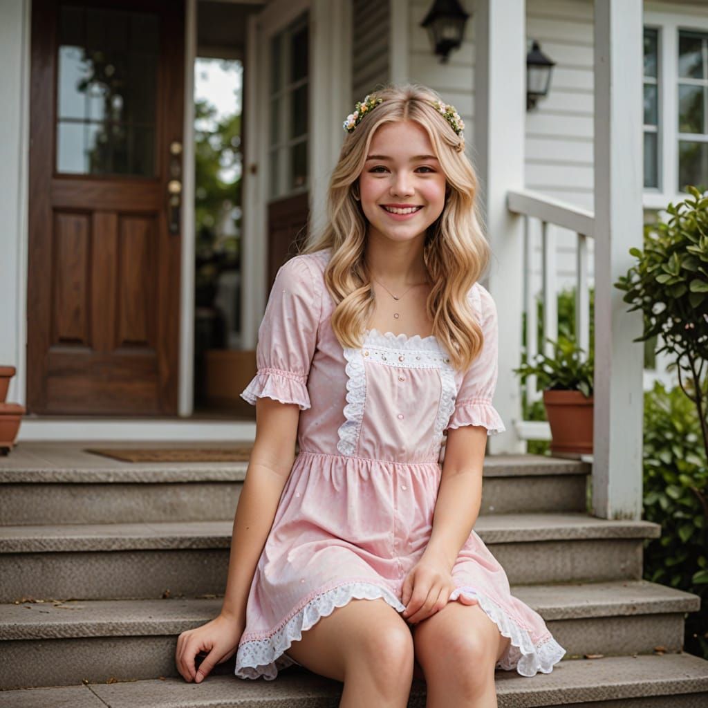 This image captures a young man in a frilly pink and white Easter dress, sitting on a porch with a smiling woman. The scene is set in a warm and natural light, with a focus on the beauty of everyday moments.