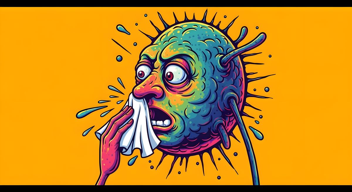 a funny cartoon style biological mirobe with a cold blowing its nose on a tissue,