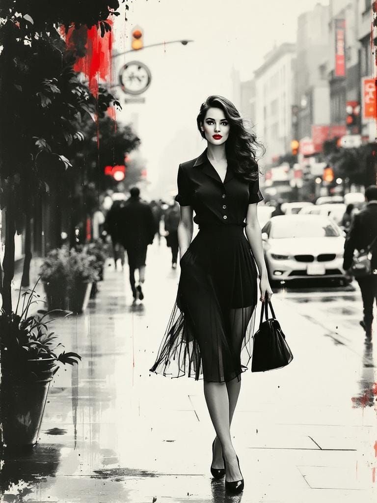 A captivating image of a 1950s pin-up woman standing on a busy city sidewalk. The artwork features bold contrasts, luminous colors, and meditative simplicity in a sumi-e style.