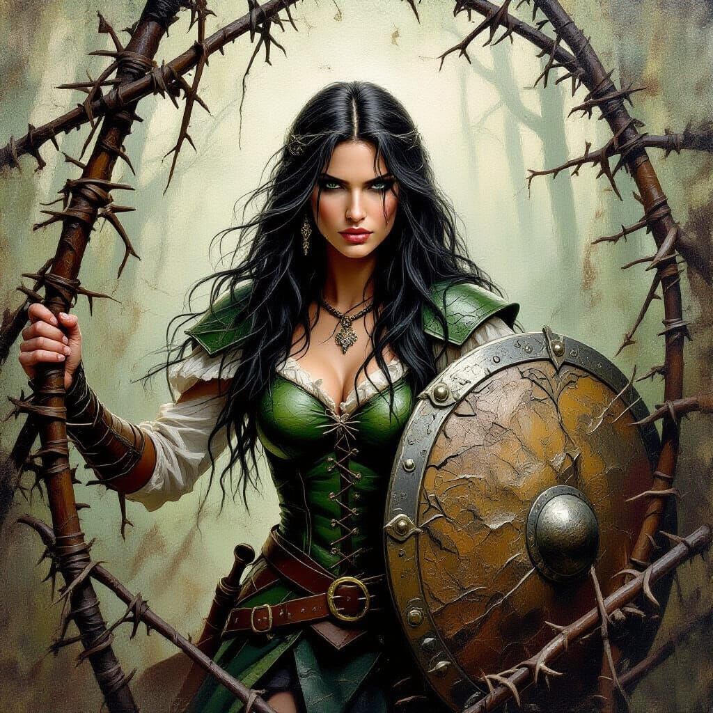 A striking picture of a forest goddess emerging from a thicket. The encaustic impasto painting features visible brush strokes and a misty palette of browns, creams and greens.