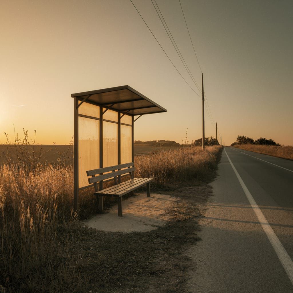 This image depicts an empty rural bus stop at twilight on a quiet road. The scene features muted colors and long shadows, evoking a contemplative and melancholic atmosphere with a minimalist aesthetic.