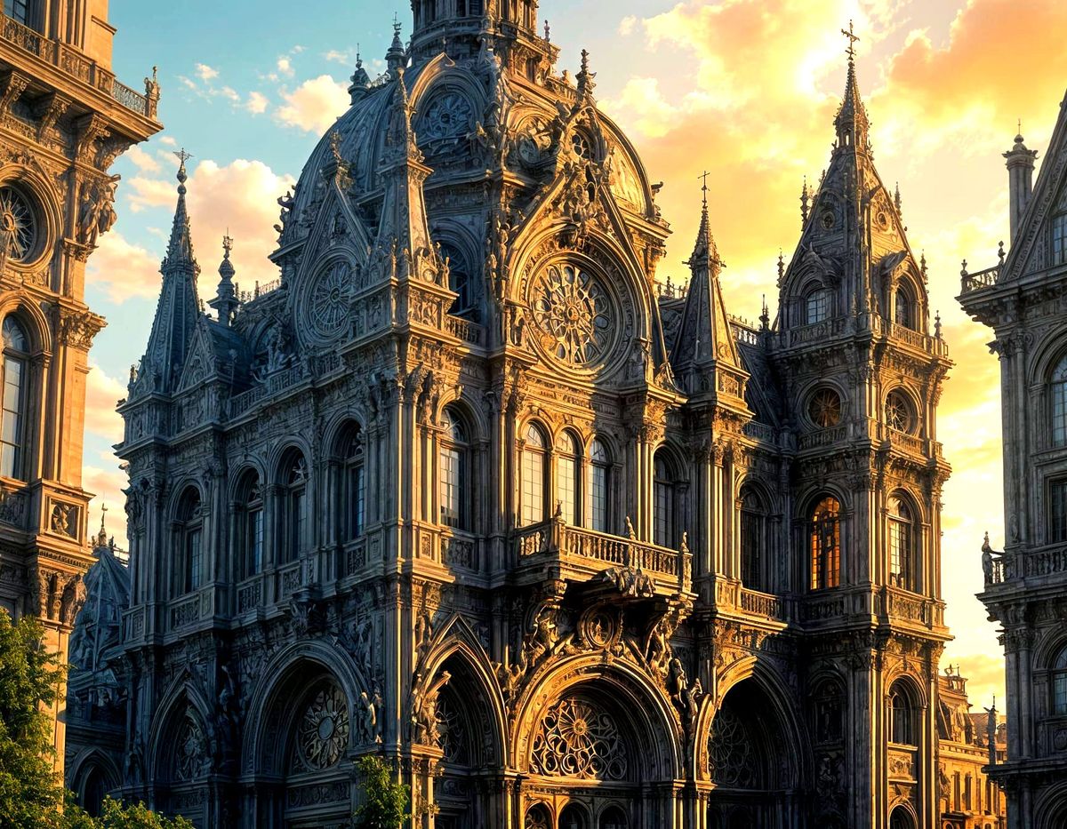 A hyperrealistic illustration of a futuristic Rome where gods abandon a majestic city. The image blends art nouveau and rococo architecture with surreal, gothic, and cyber fantasy elements.