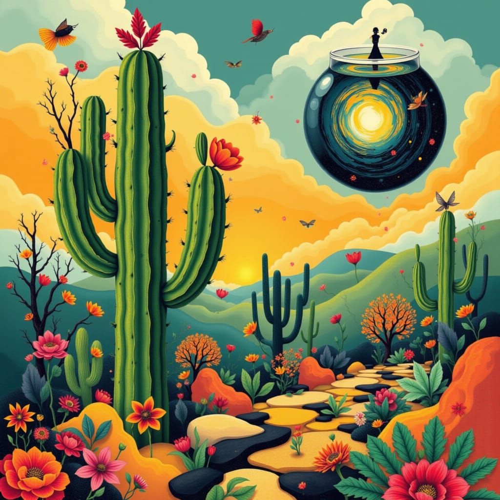 This abstract, retrofolk image depicts a dreamlike scene with a giant cactus, a chessboard, and a floating fishbowl filled with clouds. Features bold outlines and a muted color palette.