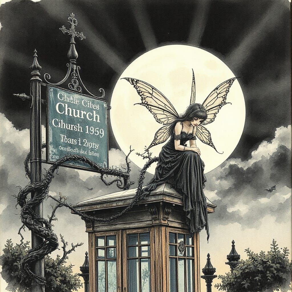 A gothic fairy sits on a church converted into a bus stop. The fairy wears tattered Victorian clothing. Twisted ironwork and vines decorate the scene under a moonlit sky in pastel and black as delicate watercolor and ink blend.