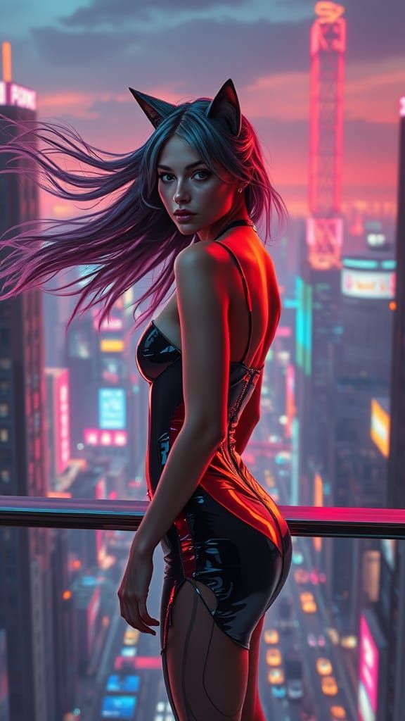 A hyperrealistic image of a woman with iridescent hair and feline features on a balcony, overlooking a neon-drenched cyberpunk city at dusk. Features holographic ads and futuristic attire.