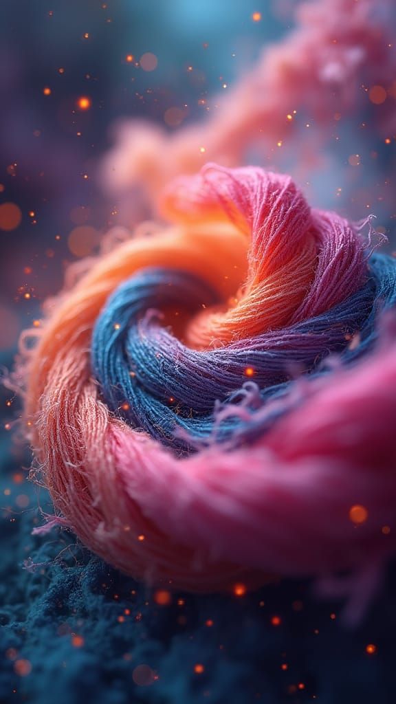 This image shows vibrant yarn forming a spiral against a cosmic backdrop. Neon glowing edges and soft focus create an ethereal, dreamy effect, as 3D rendered digital art.