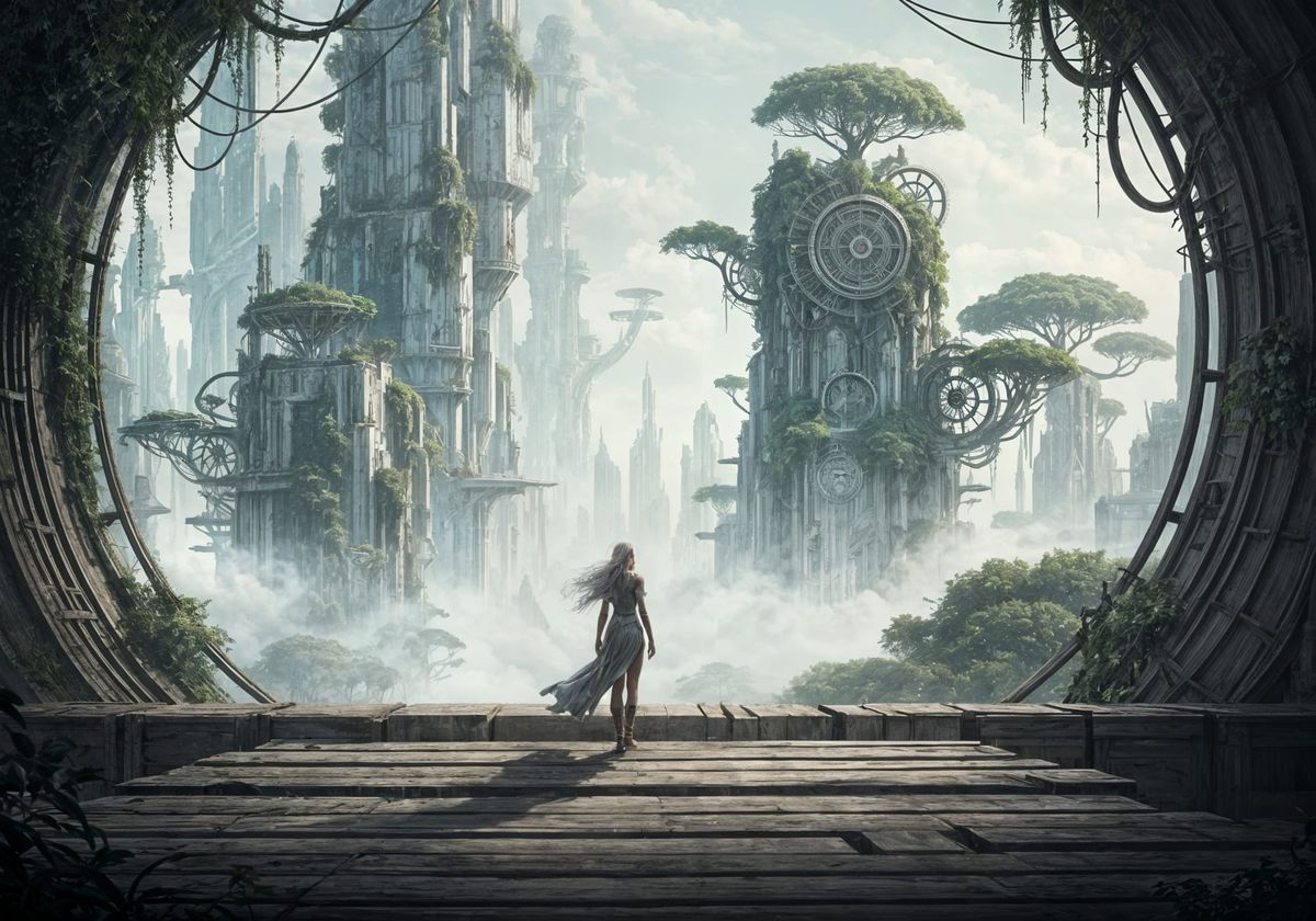 A solitary woman with flowing hair observes a vast, melancholic futuristic city where plants and trees overgrow buildings. Subtle clockwork details hint at forgotten technology, rendered in a detailed matte painting style.