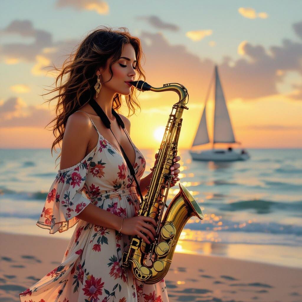 A whimsical airbrushed photo realistic full body shop, 40 year-old, beautiful bohemian rock playing a saxophone, sunset, sailboat colors, or a board gradient of spring, textured painterly, background beach, 4K, UHD, textured painterly.